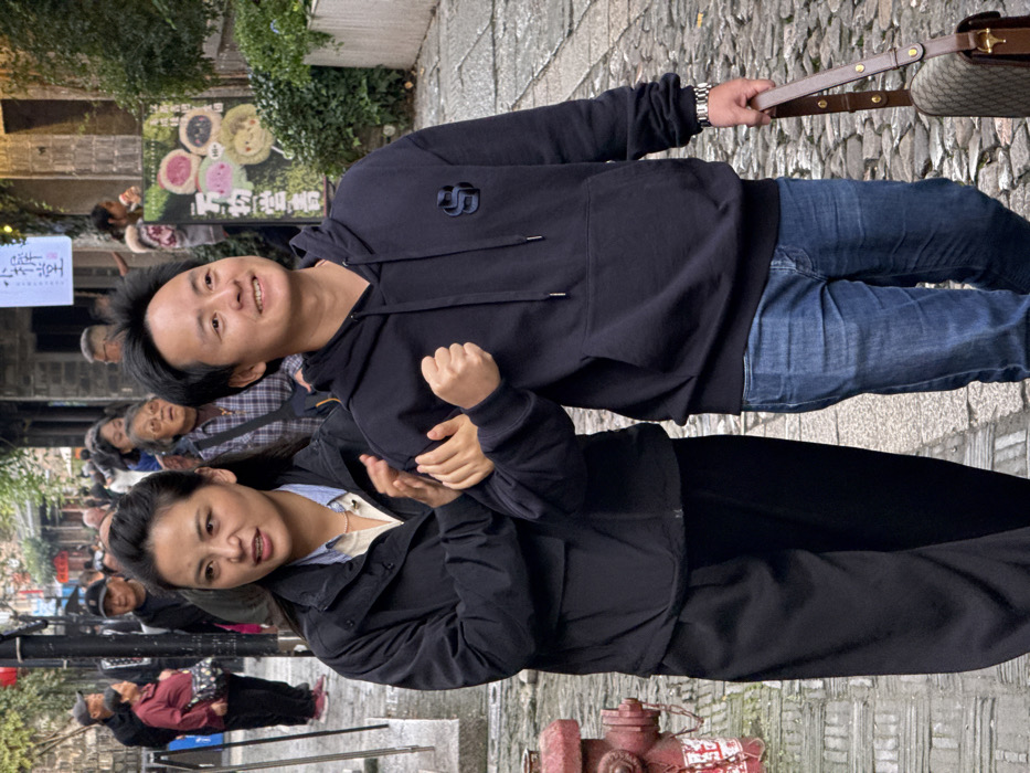 The image displays a crowded cobblestone pedestrian street in Qinhuai District, China. In the foreground, two East Asian individuals walk towards the viewer's right. On the left, a woman with dark hair pulled back wears a black collared jacket over a light-colored collared shirt with a pearl necklace, and black pants. Her left hand is placed on the man's right upper arm, and her expression shows her mouth slightly open. On the right, a man with dark hair smiles, looking upwards and to his right. He wears a dark blue hooded sweatshirt with a dark "S" emblem on the left chest, blue jeans, and a silver-toned wristwatch on his left wrist. He holds a brown leather-trimmed shoulder bag with a patterned fabric in his left hand. To the far left of the foreground, a red fire hydrant with chains is visible on the cobblestone surface. In the background, numerous blurred pedestrians populate the street, alongside traditional Chinese buildings featuring dark tiled roofs and brick walls, with a vertical sign bearing Chinese characters and a sandwich board displaying colorful food items.
