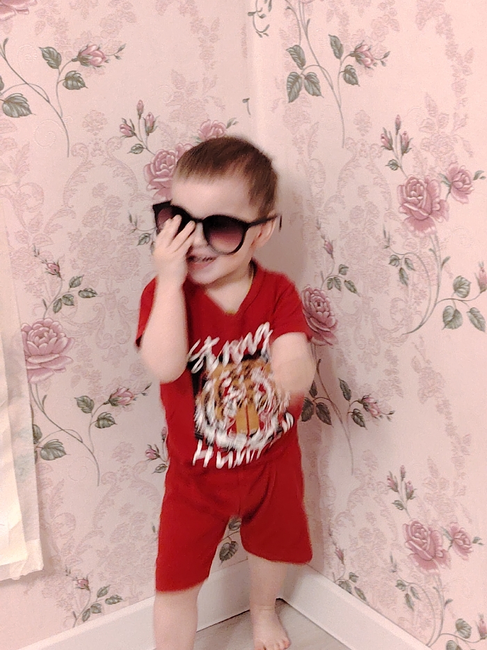 A young child, appearing to be a toddler or preschooler, stands indoors in the city of Марковский, Russia. The child, with light brown hair, is wearing a red short-sleeved top featuring a tiger's head graphic and partially obscured white text on the chest, paired with matching red shorts. The child is barefoot. Oversized black-framed sunglasses with dark lenses are worn, and the child's right hand is raised, holding the right temple of the sunglasses, revealing a wide smile beneath. The child is positioned in the corner of a room against a light pink wallpaper patterned with repeating darker pink roses and green foliage. A white baseboard lines the bottom of the wall, meeting a light-colored floor. A light-colored vertical fabric element, possibly a curtain or part of a window, is visible on the far left. The image exhibits slight motion blur.