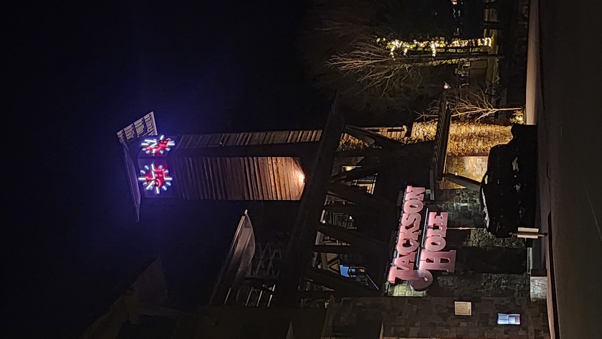 The image displays a nighttime scene of a building in Teton Village, United States of America. A large, illuminated sign with pink-red lettering spelling "Jackson Hole" is mounted on the stone-clad facade of the lower structure. Above and to the right, a tall, slender clock tower constructed of horizontal wooden planks rises. The clock tower features two visible clock faces, each outlined with blue neon lighting and containing red, snowflake-like internal illumination against a white background. A single upward-facing yellow light illuminates the lower section of the wooden tower. An elevated dark-beamed wooden walkway or bridge connects sections of the building, passing in front of the clock tower's base. The lower left portion of the building exhibits stone masonry. In the immediate foreground, a dark paved surface is visible. To the right of the entrance, an irregularly shaped, dark object covered in white material, possibly snow or ice, rests on the ground. A small, light-colored vertical marker is positioned on the paved surface nearby. To the far right, a tree wrapped with numerous warm white string lights stands among other bare trees against the dark night sky. No individuals are present in the scene.