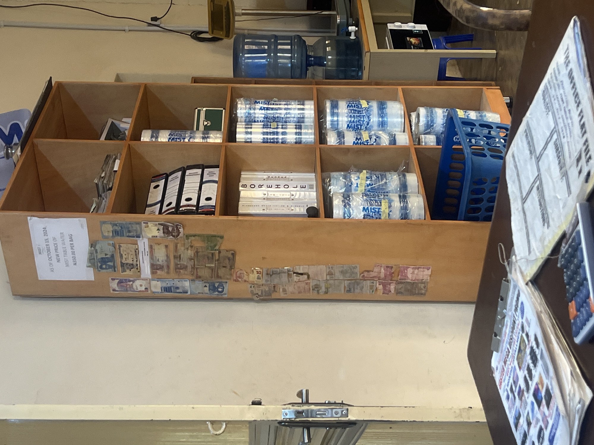 shelf in what appears to be a commercial setting, possibly a store or warehouse in Jos, Nigeria. The shelf is made of wood and contains various items, including rolls of "MIST" brand table water packaging, office supplies like binders, and a blue plastic basket. A sign is affixed to the shelf with the text "MIST AS OF OCTOBER 15, 2024, NEW PRICE OF MIST TABLE WATER ₦350.00 PER BAG." Currency notes are displayed beside this sign, possibly representing the new price. A water dispenser with multiple blue bottles sits on top of the shelf. The background includes a wall and what appears to be plumbing or ventilation equipment. To the right is a desk with an office document and a calculator.