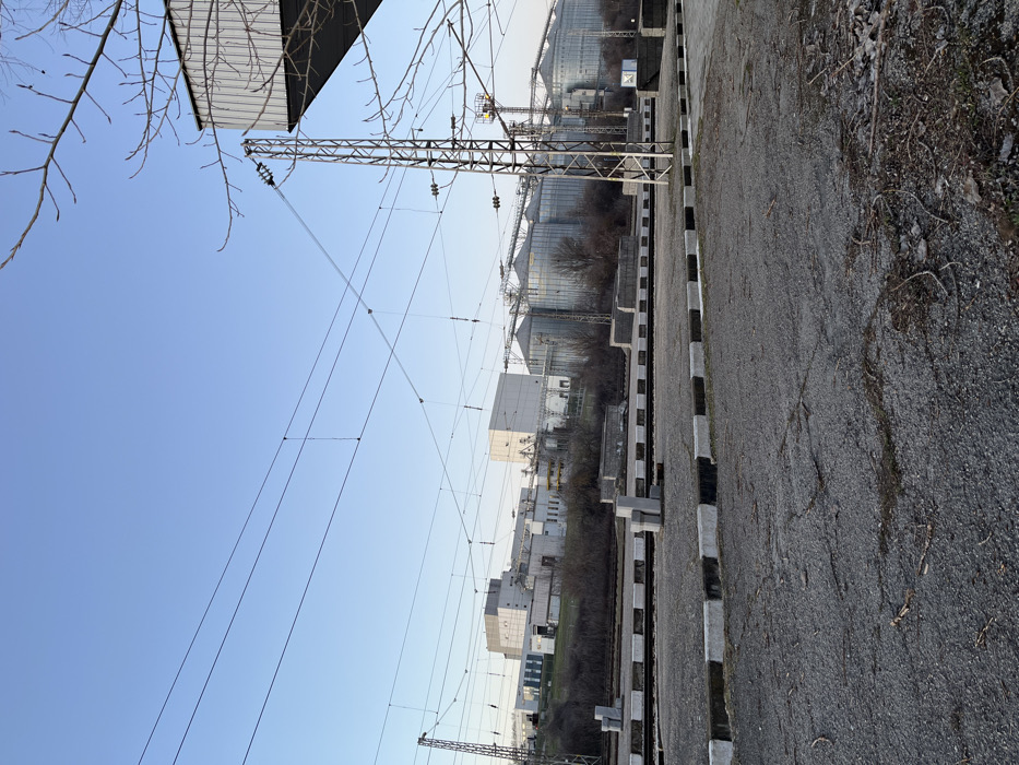 The image depicts an industrial railway scene at the Popovo railway station in Popovo, Bulgaria, under a clear blue sky. In the foreground, an asphalt or concrete ground surface, visibly cracked and strewn with small debris, extends towards a low, striped concrete barrier featuring alternating black and white sections. Beyond this barrier, multiple parallel railway tracks run horizontally across the midground. Several concrete support blocks are positioned between and adjacent to the tracks. Tall, slender metal lattice structures, likely power poles, rise from the ground, supporting a complex network of overhead electrical lines and insulators that traverse the frame. On the far right, a section of a large, dark, cantilevered structure or building overhangs into the upper right corner, with bare tree branches extending from its vicinity. The background features a distinct industrial complex. To the left and center, a series of light-colored, multi-story industrial buildings, possibly a factory or processing plant, are visible with various attached structures and piping. To the right, a prominent cluster of large, reflective, cylindrical grain silos stands, connected by conveyor systems, indicative of an agricultural storage or processing facility. Sparse, leafless vegetation and bare ground are present along an embankment behind the railway tracks, separating them from the distant buildings and silos. No individuals or active vehicles are present within the scene.