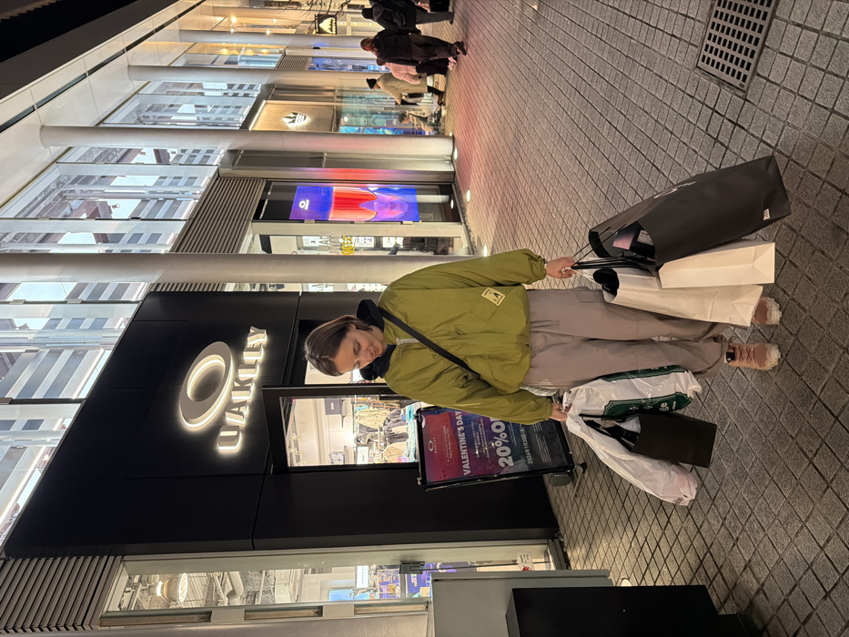 The image depicts a young adult female standing on a paved sidewalk in front of a row of retail stores in Shibuya Parco, Shibuya, Tokyo, Japan, during evening hours. The subject, positioned slightly right of the center, wears a hooded olive-green jacket with a black hoodie underneath, light brown cargo-style pants, and brown high-top sneakers. A black cross-body strap is visible across her chest. She is actively carrying five shopping bags: two in her left hand (one translucent white plastic containing a dark bag, and one green) and three in her right hand (one white paper bag, two black bags). She is looking downwards with a slight smile. Immediately behind the subject is the brightly illuminated entrance to an Oakley store, prominently displaying its glowing white logo. To the left of the entrance, a black A-frame sign advertises a "Valentine's Day 20% OFF" promotion, with dates 2024/1/30-2/18 visible in Japanese characters. To the right of the Oakley store, an Adidas store is visible, featuring a vibrant digital display screen. The building's architecture is characterized by modern styling with prominent vertical white columns and expansive glass window panels. The sidewalk is paved with interlocking rectangular grey pavers, and a metal grate is present on the far right of the frame. Several other pedestrians are visible in the blurred background, further down the street.