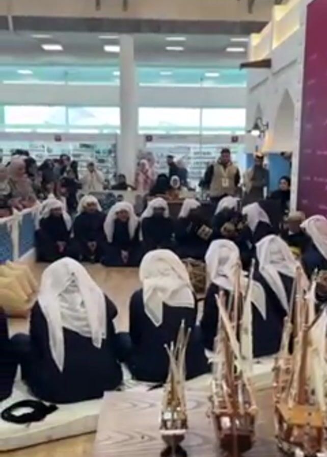 The scene captures a room filled with people. In the foreground, a group of men sits cross-legged on the floor, their backs to the camera, all dressed in black with white headscarves. On a low table in front of them sit three intricately crafted model ships, adding a touch of artistry to the gathering. In the background, more individuals are visible, some standing and some seated, creating a sense of community and shared space. The room's modern architecture features large windows allowing ample natural light, and the overall atmosphere feels warm and welcoming.