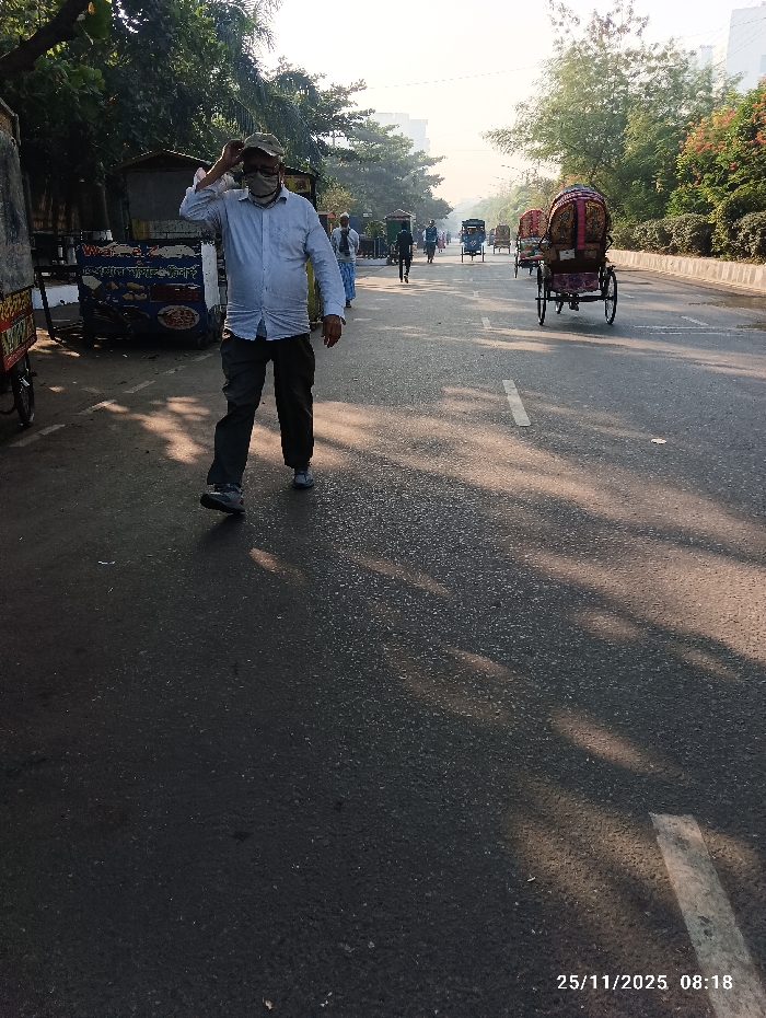 A man wearing a mask and hat walks along a street. Rickshaws are on the road. One carries a passenger. Other people walk in the distance. Stalls line the side of the road to the left. Trees line the right. The road is mostly shaded.