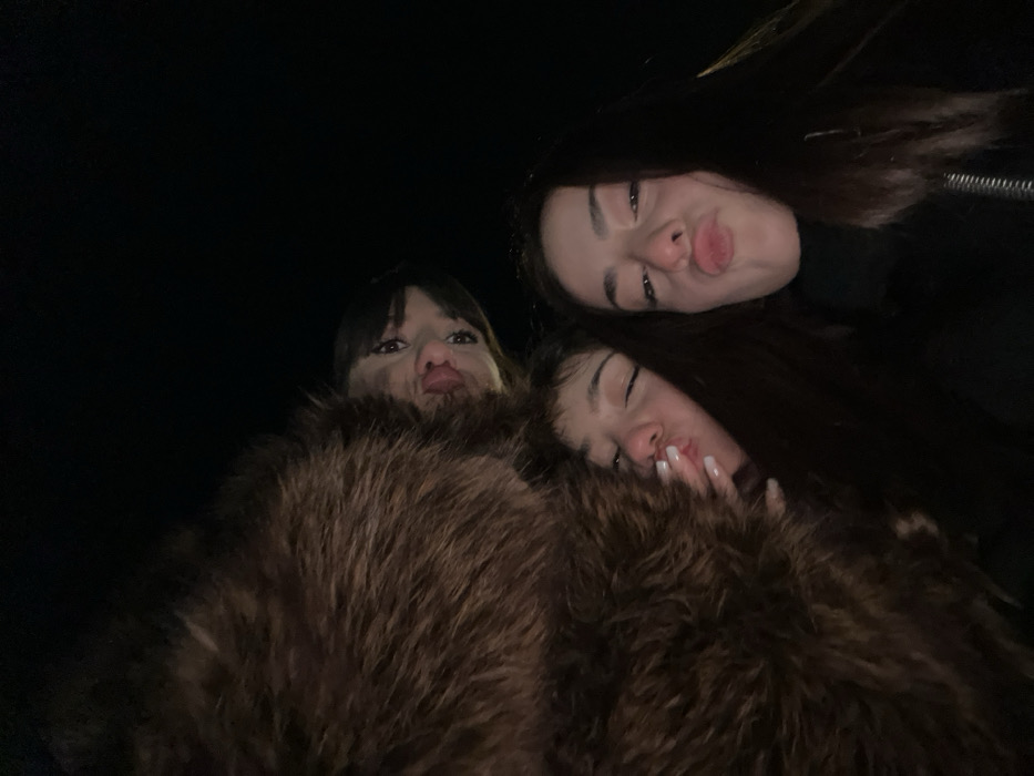 Three women pose closely together for a selfie taken from a low angle. The woman on the left has brown hair with bangs, peering out from behind a large, brown, fur-like garment that the other two women are also nestled in. The woman in the upper right has long, dark hair and puckered lips. The woman nestled beside her, on the lower right, has similar dark hair and is also puckering her lips, with her hand visible near her face, showcasing long, white fingernails. The background is dark.