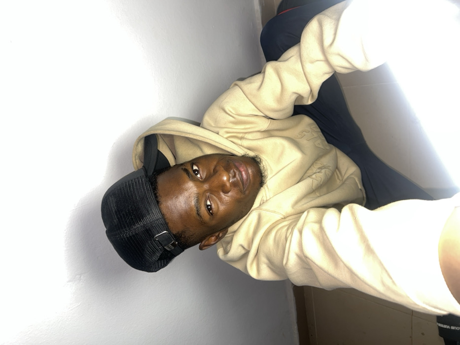 A young man wearing a black baseball cap and a light beige hoodie takes a selfie