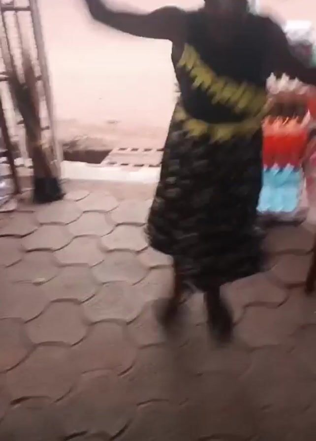A young girl dances on a tiled patio in front of a roadside shop. The girl wears a black dress with yellow fringe and black sandals. She raises her arms and smiles as she moves. Behind her is a table stacked with bottled drinks and packaged snacks. A silver car is visible in the background. The scene appears to be outdoors, with a street or road in the distance.