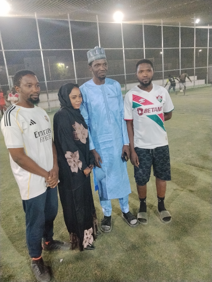 Four people stand on a grassy field near a netted enclosure. One man wears a white Real Madrid shirt and jeans, while the woman next to him is covered in a black hijab-style dress with floral details. The taller man is in a pale blue robe and cap. Finally, another man wears a white soccer jersey, dark shorts, socks, and slides. In the background, other people play a sport on the field. Overhead lights illuminate the scene.