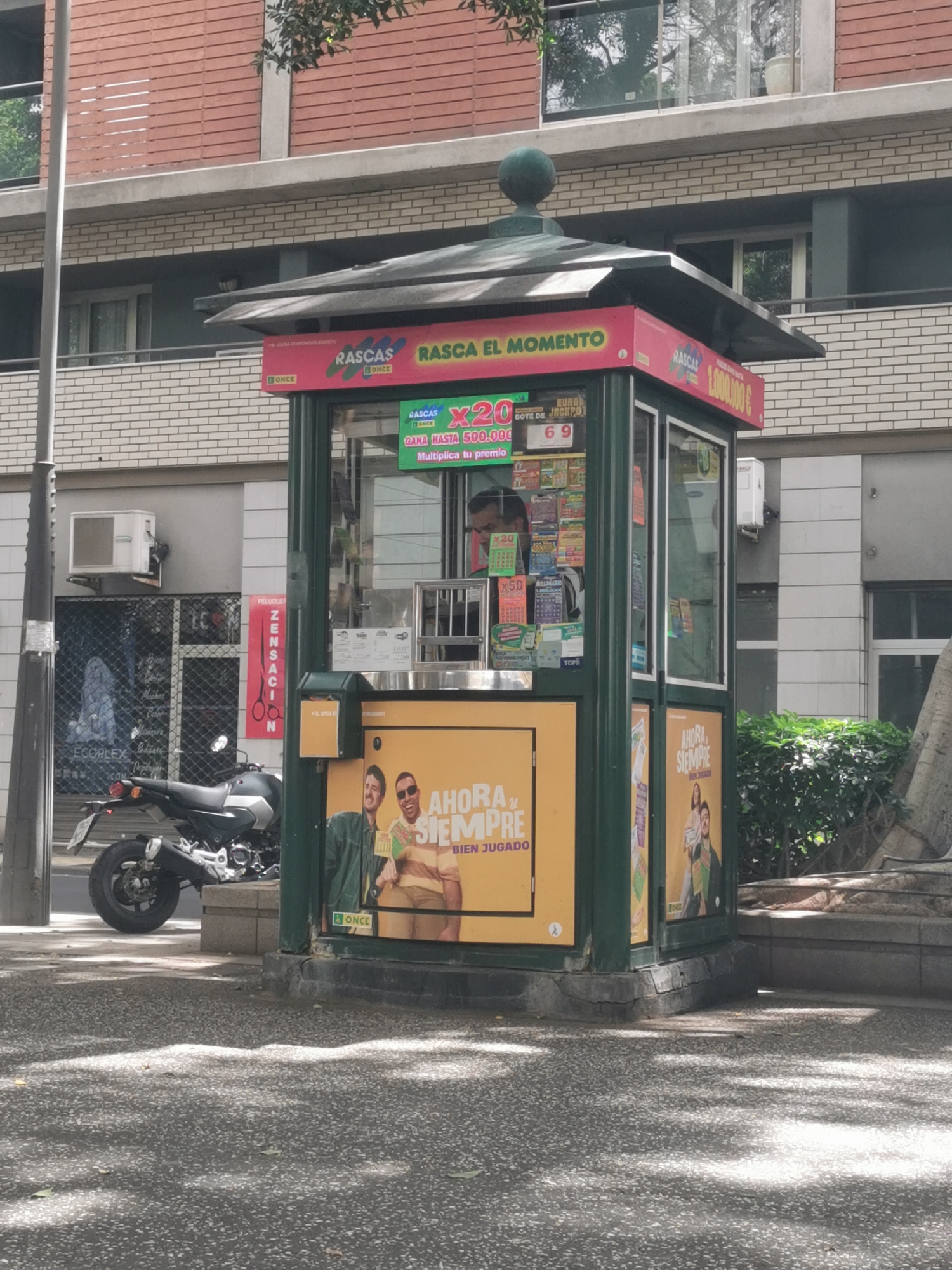 The image depicts a ONCE lottery kiosk in Santa Cruz de Tenerife, Spain. The kiosk is green with a pink roof and advertisements featuring the phrase "Rasca el momento" (scratch the moment). The kiosk is in front of a building with multiple floors. A motorcycle is parked to the left of the kiosk in front of a storefront, identified by a red sign with scissors as a "Peluquería Zensación" (Zensación Hair Salon). A person can be seen inside the kiosk, presumably the vendor. There are advertisements on the kiosk featuring two men. There are also bushes beside the kiosk.