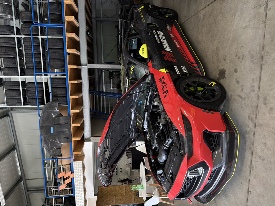 The scene depicts an interior view of a commercial garage or workshop located in Meuspath, Germany. The primary subject is a highly modified racing car, resembling a Ford Mustang, parked on a grey concrete floor. The vehicle's livery is predominantly red on the front section, transitioning to black along the sides, with bright yellow accents on the side mirrors, brake calipers, and body trim lines. Sponsor logos such as "NANKANG MOTORSPORT," "VULCAN ALPHA," and "RTR VEHICLES" are visible on its exterior. The car's hood is open, exposing a performance-oriented engine bay with a prominent air intake system and various mechanical components. The front features an aggressive splitter with a yellow edge. In the background, on the ground level to the left, a small break area includes a white round table, two white chairs, a green plastic bottle, and a clear glass. A sink and a checkered towel are visible beyond the table. Above the main floor, a mezzanine level with a blue metal railing extends across the upper portion of the facility. This mezzanine functions as a storage area, featuring metal shelving units densely packed with stacks of black tires. A dark, possibly carbon fiber, vehicle body panel rests on the mezzanine floor near the railing. Metal stairs leading to the mezzanine are partially visible on the right side of the frame. The facility is illuminated by overhead lighting. No individuals are present in the image.