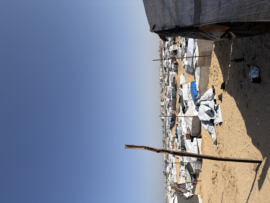 The image displays an expansive displacement camp situated on sandy, arid terrain in Khan Yunis, Palestinian Territory, under a clear, bright blue sky