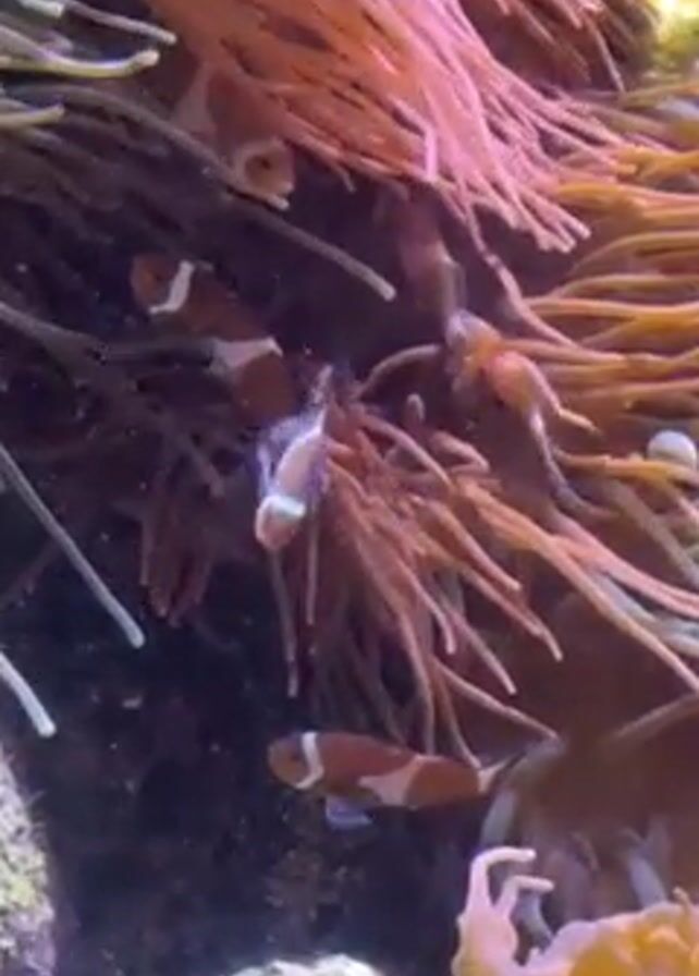 clownfish swimming among pink and orange anemones in an aquarium. Some of the fish are partially obscured by the anemones. The bottom of the aquarium is visible with some rocks and plant life. A bright light is visible at the top of the frame. The anemones sway in the water.