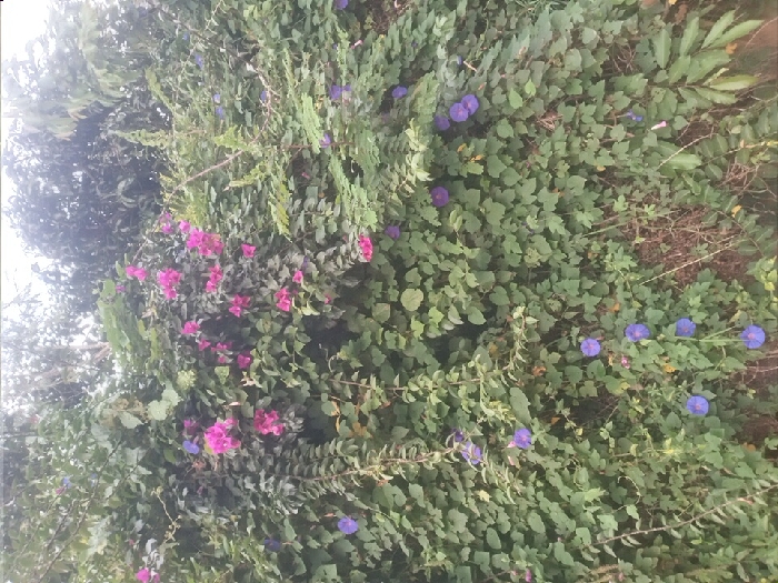 A lush green wall covered with various plants. Pink bougainvillea flowers stand out against the foliage. Blue morning glory flowers are scattered throughout the greenery. Different types of leaves and vines intertwine, creating a dense and vibrant natural tapestry. The composition suggests a thriving, overgrown garden or landscape.