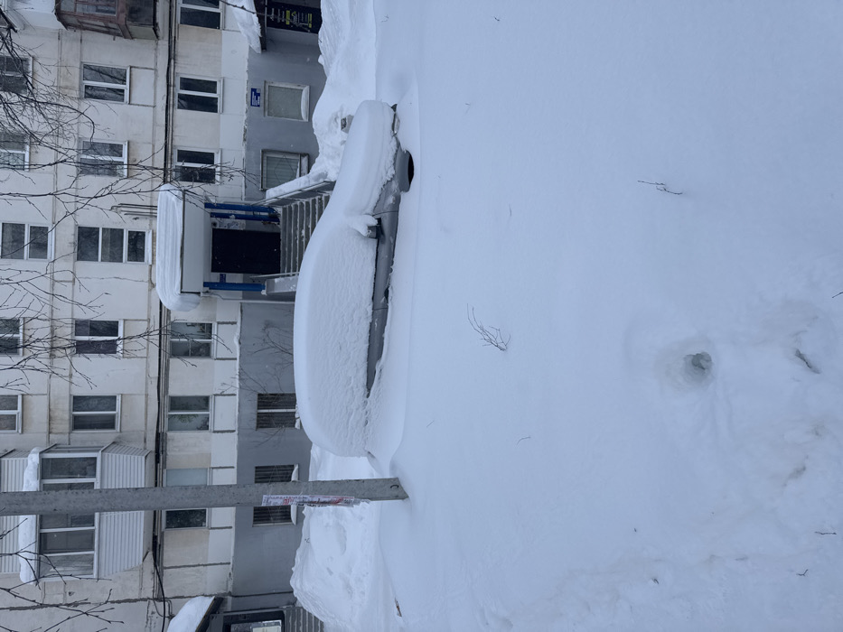 A snow-covered car is parked beside a snowdrift next to a building. The car is almost entirely buried in snow, obscuring its features. The snowdrift extends from the side of the building and blends into a vast, snowy landscape. The building has multiple windows and appears to be an apartment complex. A metal pole stands in the foreground. Bare branches of trees are visible against the building's facade.