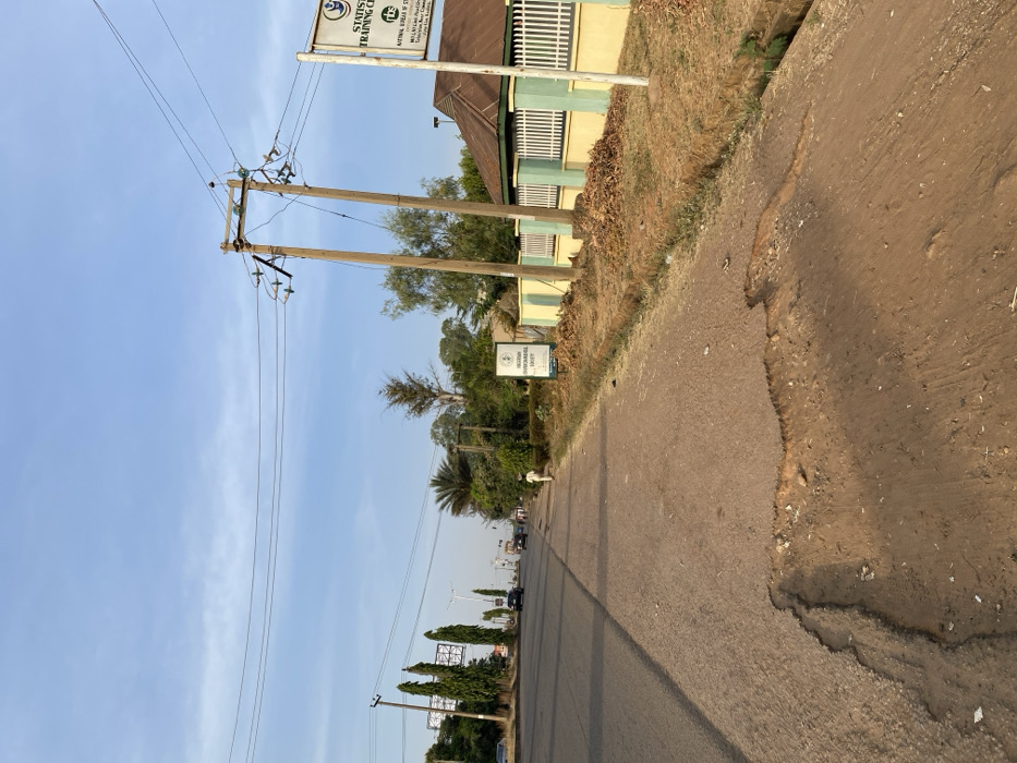 The image presents an outdoor street scene under a clear, bright blue sky in the city of Television, Nigeria. The perspective is a ground-level view looking down a paved road with an adjacent unpaved shoulder, extending into the distance. In the immediate foreground on the right, the paved shoulder is severely eroded, exposing an extensive area of brown soil and gravel with an uneven, jagged edge. A narrow, shallow concrete drainage ditch runs along the far right edge of this degraded section. Accumulations of dried leaves and organic debris are visible along the base of a boundary wall. This wall is light-yellow with green structural pillars and topped with a white picket fence, delineating a property. Along this property line, two prominent informational signs are visible. The sign on the far right is partially cropped and displays "STATISTICS TRAINING CENTRE" and "NATIONAL BUREAU OF STATISTICS (NBS)," with text partially revealing "Television, Kaduna." A second, smaller sign further down the path displays "NIGERIAN GEOLOGICAL SURVEY." Two prominent wooden utility poles, equipped with multiple insulators and power lines, stand along the right side of the scene. Behind the fence, a building with a dark, sloped roof is partially visible, surrounded by various trees and shrubs. In the midground, a single individual, dressed in light-colored clothing, walks away from the viewer on the unpaved shoulder. The paved road, occupying the left side of the frame, shows two lanes and recedes into the background. Several vehicles are visible on the road in the far midground, also moving away. Tall, slender, dark green trees line the left side of the road, accompanied by additional utility poles and streetlights. A large, unbranded billboard structure is present on the far left. The background consists of the road continuing under the clear sky, with distant vegetation and structures faintly discernible on the horizon.