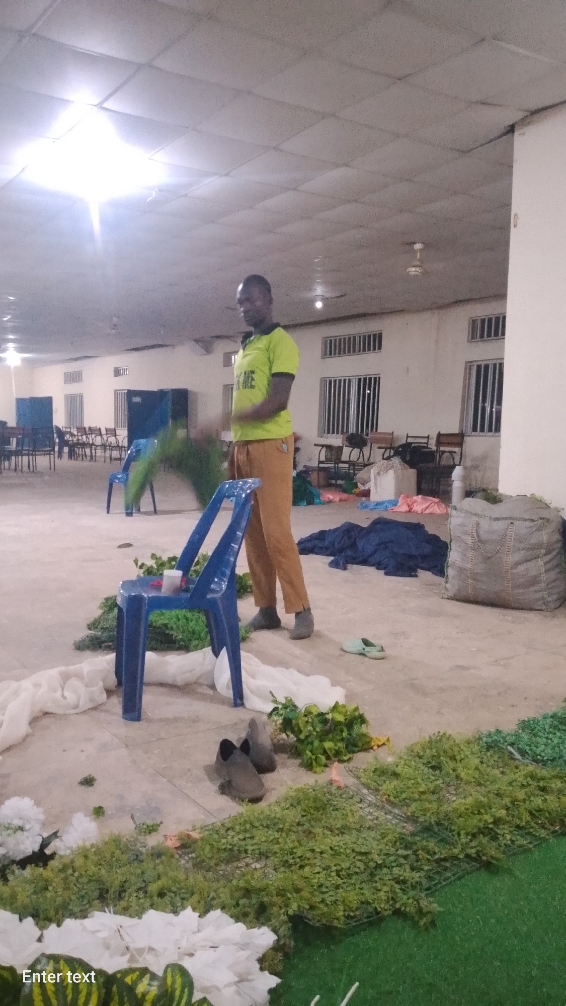 The scene is an indoor event hall in Gudi, Nigeria. An adult male with dark skin and short dark hair, wearing a lime green short-sleeved t-shirt and brown trousers, stands in the mid-foreground. His arms are blurred from motion, consistent with handling green foliage. The concrete floor is partially covered with artificial green foliage on mesh, white artificial flowers, and draped white fabric. An inverted blue plastic chair has a small white cylindrical object resting on its seat. Additional items on the floor include scattered green foliage, two grey slip-on shoes, one light green sandal, and piles of blue and pink fabric. In the background, numerous wooden chairs and tables are visible, some stacked, along with a dark blue cabinet. A large, woven grey sack stands on the right. Overhead fluorescent lights illuminate the space; barred windows are present on the far wall.