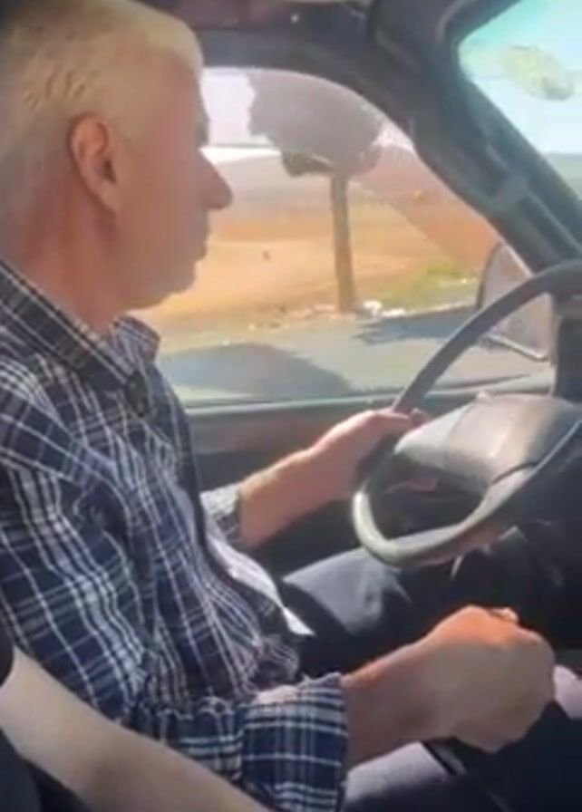 A person is driving a car through a town, presumably in a desert environment. The driver appears to be an older man with short, white hair wearing a blue plaid shirt and dark pants. The dashboard of the car has a carpeted cover and a hanging lion head ornament. The camera appears to be situated inside the vehicle, filming the driver and the view through the windshield as the car navigates the streets.
