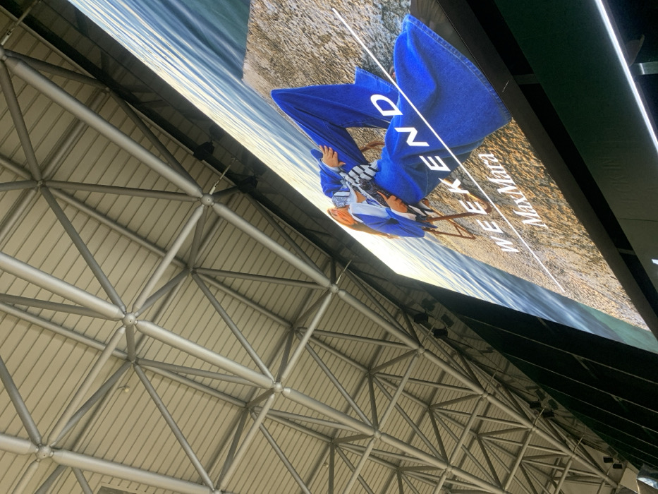 This image depicts the interior of a large public building, identified as Malpensa Airport in Ferno, Italy. The perspective is an upward-angled shot. The upper and left portions of the frame are dominated by a silvery-gray metallic space frame roof structure, composed of interconnected cylindrical beams forming a tessellated pattern of triangles and squares, supporting a light-colored, possibly paneled ceiling. The lower and right portions feature a large, illuminated digital advertisement screen positioned diagonally. The advertisement prominently displays a female model in a reclining or seated pose on a light-colored wooden chair. She is dressed in a royal blue, long-sleeved garment with wide-leg trousers and a multi-patterned (white, black, and blue) scarf. Her light brown hair is visible. The background of the advertisement image features calm blue water on the left, meeting a rocky or pebbled shoreline on the right. Overlaying this imagery, the word "WEEKEND" is displayed in large white capital letters, with a thin white horizontal line underneath, followed by "MaxMara" in smaller white text. Dark architectural elements are visible below and to the immediate left of the digital screen.