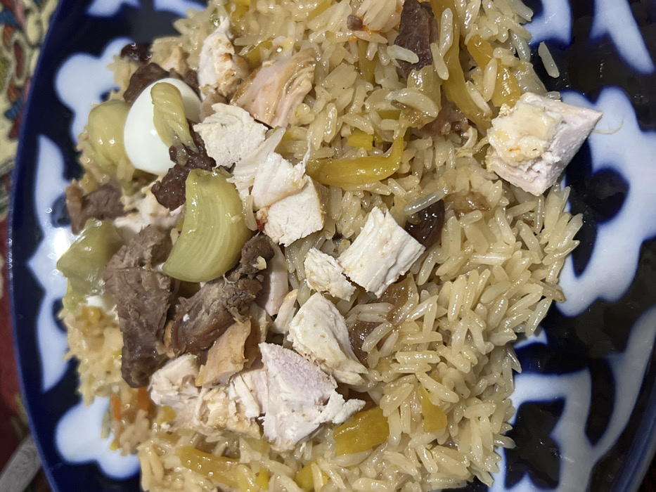 - "A close-up image displays a serving of traditional Uzbek pilaf (palov) in a blue and white patterned ceramic bowl, located in Navoiy City, Uzbekistan" by FM-RkAm93, licensed under CC BY 4.0