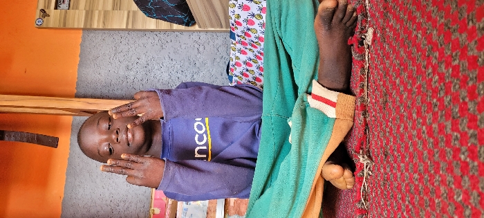 The scene is an indoor setting in Bukuru, Nigeria, where a young individual, likely a child, is seated on a red and black checkered rug