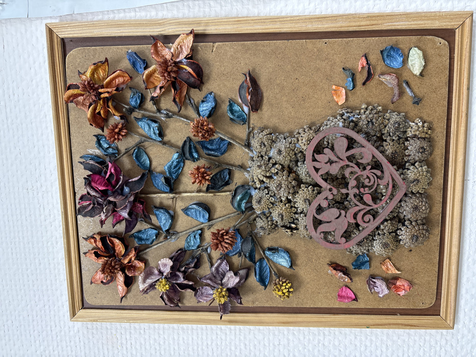 An upright, rectangular artwork crafted from dried natural materials, encased in a light-colored wooden frame, is depicted against a textured white wall in Novosergievka, Russia. The artwork's background is a plain, light brown board. The central subject is a vase-like form constructed from numerous small, clustered, light brown dried seed pods or florets. Superimposed on the upper portion of the vase is a pink, decorative, heart-shaped cutout featuring an ornate scroll pattern. Extending upwards from the vase are multiple thin, bare stems, each adorned with various dried botanical elements. These include several prominent dried flowers in shades of faded orange, deep magenta, and pale purple, some with distinct yellow centers. Interspersed among the flowers are numerous small, oval-shaped dried leaves, coated with a metallic blue-green finish. Additionally, smaller, spiky, reddish-brown dried flower clusters are present. At the bottom of the frame, several loose, scattered dried petals or leaf fragments in varying shades of pink, orange, blue, and cream are visible. No individuals or active subjects are present.