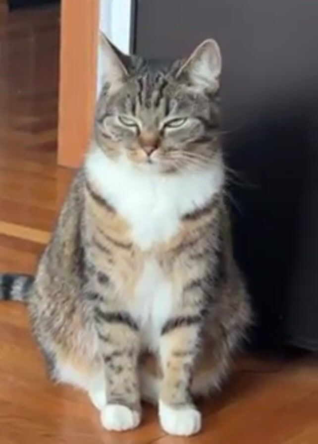 brown and white tabby cat sitting on a wooden floor. The cat is sitting upright with its front paws neatly placed in front of it. It has a white bib and a generally grumpy expression. The background includes a wooden door frame and a dark cabinet. The camera gradually zooms in on the cat's face.