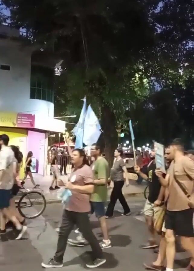 crowd of people walking and biking down a street at night. Many are waving Argentinian flags. There is a line of police officers in the distance, appearing to block off a section of the road. Some businesses are visible on the left side of the frame. Trees line the street, and lights from the city illuminate the scene.