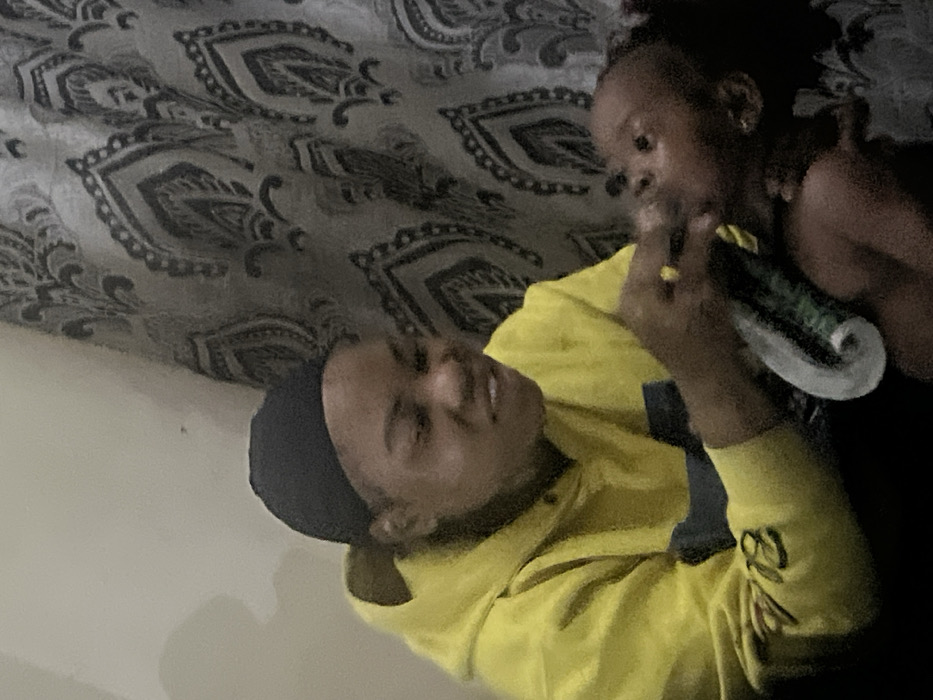 Two individuals are visible; one is lying down wearing a yellow hoodie with a dark head covering. The other, a child, is seated and holding a small green object near the first individual's face. The setting appears to be indoors, on a patterned surface possibly a bed. The child is slightly out of focus and wears a dark tank top. The image has a relatively low lighting.