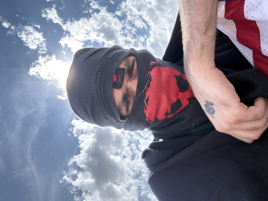 A person wearing a grey balaclava with a red skull print looks into the camera. Their eyes and nose piercings are visible. A black fabric tag is seen on the balaclava. The person wears a black hoodie and a partial red and white jersey is visible. A tattoo is on the left wrist. The sky with clouds and the sun are in the background.