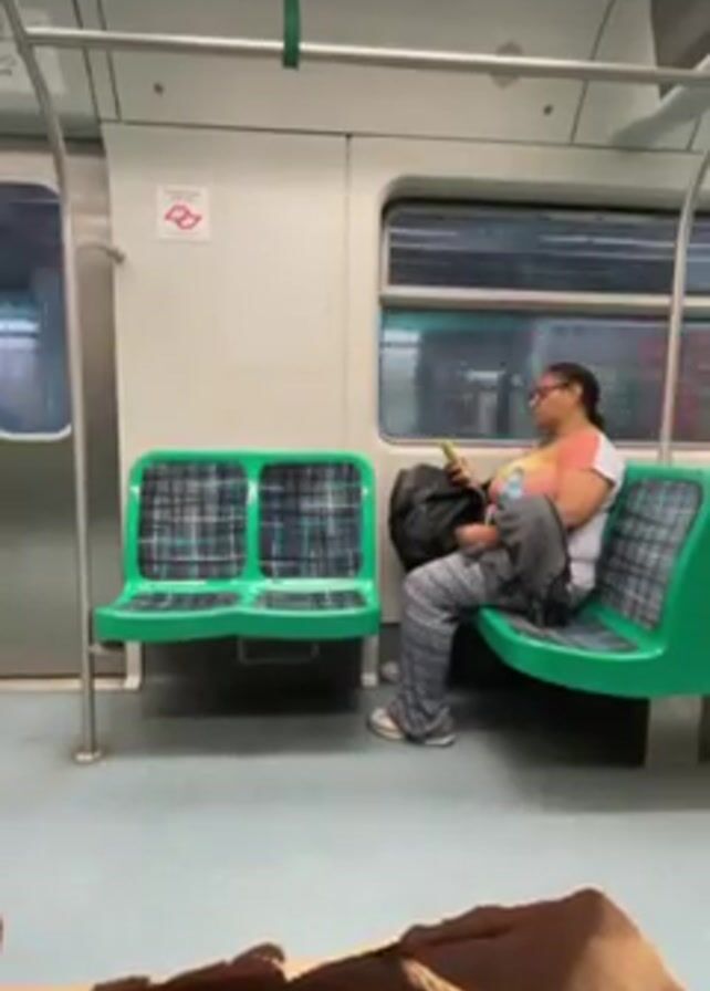 interior of a train car. A woman wearing glasses, a white shirt with colorful accents, and patterned pants sits on a green seat with a plaid pattern. She is holding a cell phone and has a large black bag next to her. Another set of empty green seats are visible across from her. The train car is clean and well-lit, with a metal interior. The video appears to be taken from a lower angle.