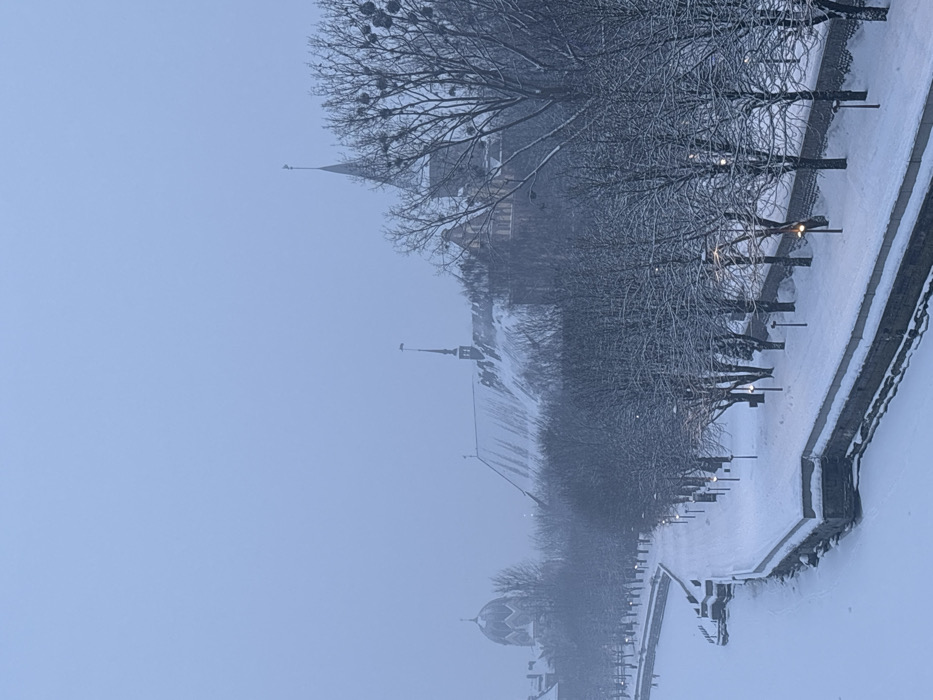 A snow-covered landscape reveals a row of bare trees along a pathway defined by a low stone wall. Streetlights punctuate the scene. In the background, architectural structures emerge through the snow and mist, including spires and a rounded dome. The sky is overcast, contributing to a wintery and muted atmosphere.