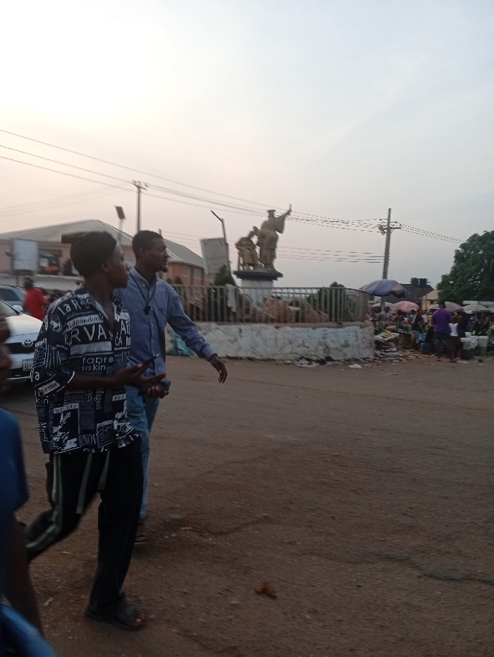 Two men walk on a paved road. A roundabout with a monument sits in the background. There is a building on the left and a marketplace on the right. Power lines are visible overhead. The sky is clear.