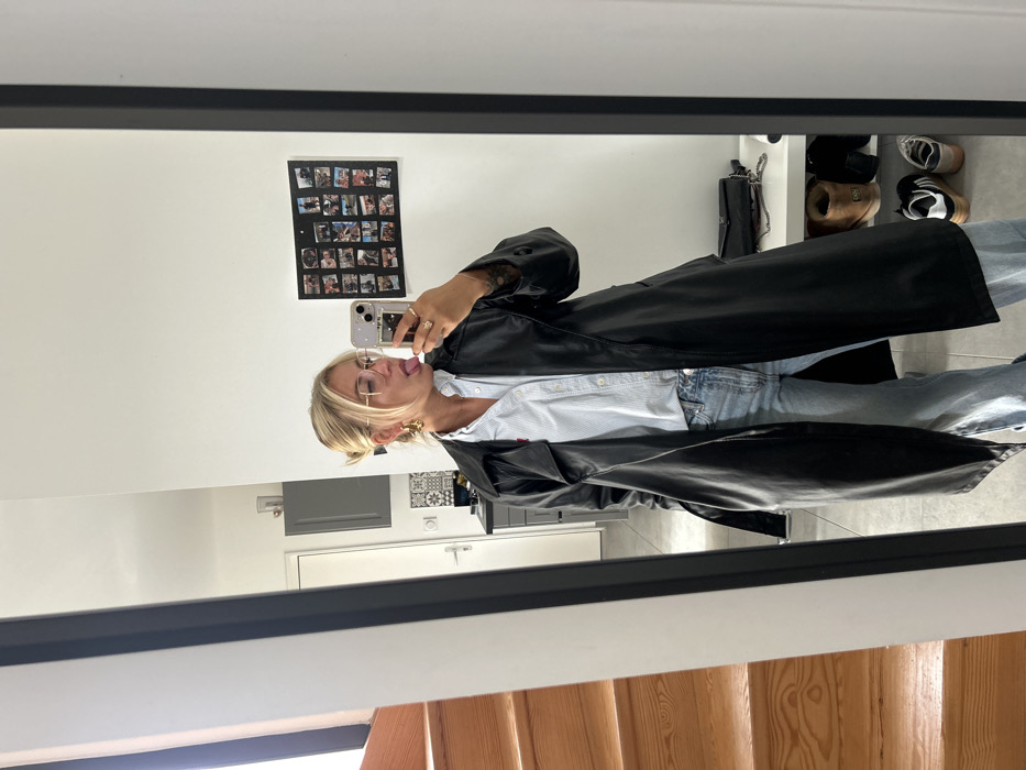 This image, captured in Chambœuf, France, depicts a mirror selfie of a female subject in an indoor setting. The subject, with blonde hair pulled into a bun and wearing square-framed glasses, is dressed in a light blue and white striped collared shirt, a long black faux-leather trench coat, and light blue denim jeans. She holds a light-colored smartphone, equipped with a ring holder, in her right hand to photograph her reflection, while playfully extending her tongue. Gold-toned hoop earrings adorn her ears, and a ring is visible on her left ring finger. A dark tattoo is visible on her right forearm. The reflected environment includes a light-toned wooden staircase with white risers on the left side of the frame. The background wall is white, featuring a black-framed grid containing multiple small photographs mounted on it. Beneath the photograph grid, a white multi-tiered shelf displays a black purse with a silver chain strap, a pair of light brown Ugg-style boots, dark boots, and two pairs of athletic sneakers. To the reflected left of the subject, a white door with a silver handle is partially visible, adjacent to a dark gray cabinet or counter and a section of black and white patterned wall tiles. A small, light-colored circular object is also present on the white wall near the door. The floor throughout the visible interior space is a light gray tile.