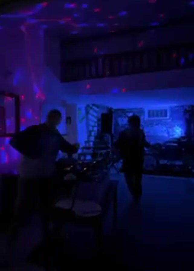 Two people are in a dimly lit room with green, blue, and red disco lights flashing on the ceiling. One person stands behind a table on which there is DJ equipment and appears to be adjusting the equipment. The other person is standing further away, watching and listening. In the background is a staircase leading to a second floor and what appears to be a music setup or band equipment illuminated by blue lights.