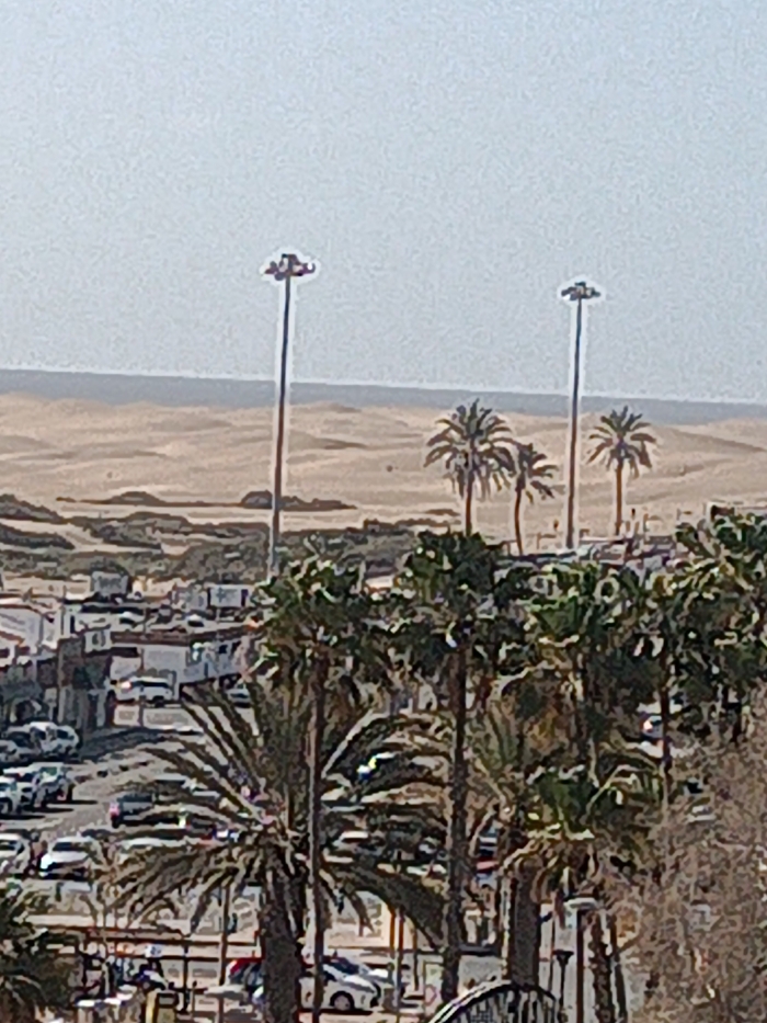 An elevated, distant view captures a sprawling urban area backed by extensive natural sand dunes, situated in San Bartolomé de Tirajana, Spain. The scene is illuminated by daylight under a pale blue to light grey sky, suggesting clear weather. In the far background, vast, undulating sand dunes of a light brown or beige hue dominate the horizon, with a faint, lighter line possibly indicating the sea beyond them. Below these primary dunes, a transition zone shows smaller sandy formations interspersed with sparse, dark green vegetation. Two tall, slender floodlight poles, each topped with a cluster of bright lights, rise prominently from this mid-ground area into the sky. Several palm trees are also scattered across this intermediate section. The foreground is occupied by a dense urban landscape, characterized by numerous low-rise buildings, mainly white, beige, and light grey, suggesting a mix of residential and commercial structures. Streets and parking areas are visible, containing multiple parked vehicles of various types, including cars and vans, predominantly light or dark-colored. A significant number of palm trees, with green fronds and brown trunks, are interspersed throughout the urban development, partially obscuring buildings and streets. In the immediate bottom-right foreground, a dark, curved, metallic structure, possibly a railing or decorative element, is partially visible, indicating the elevated vantage point from which the image was captured. No individuals or specific actions are discernible within the frame due to the distance.
