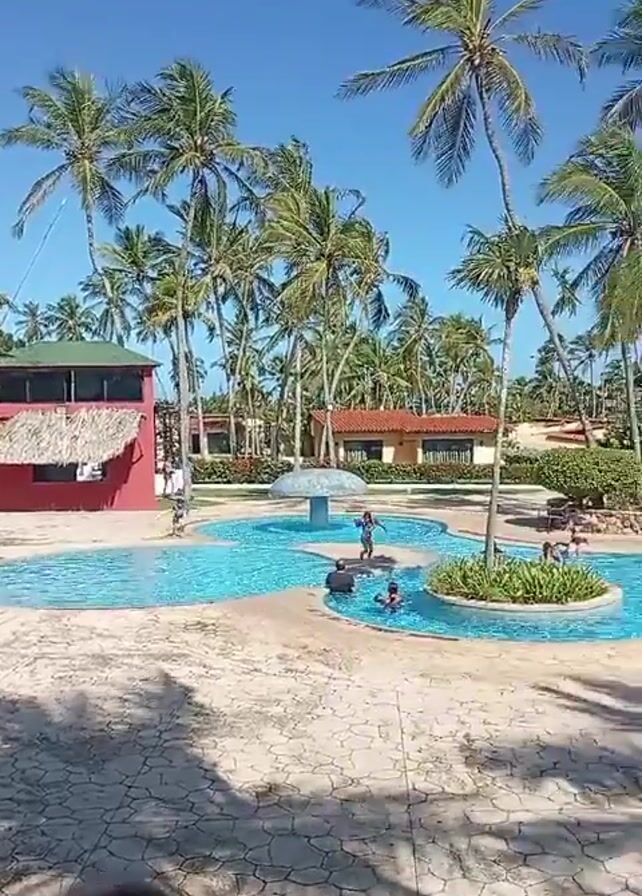n outdoor swimming pool in a tropical setting. The pool is made up of several interconnected sections of varying depths. The water is clear and blue. A number of people are in the pool, including children and adults. Some are swimming, while others are wading or floating. Palm trees surround the pool area, and there are several small buildings and huts nearby. The sky is clear and blue, and the sun is shining brightly.