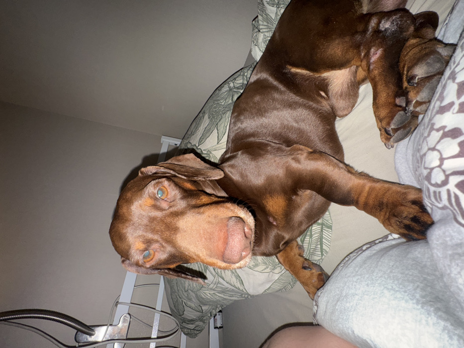 - "A brown short-haired dachshund dog is depicted lying on a bed in an indoor setting" by FM-xqHZp2, licensed under CC BY 4.0
