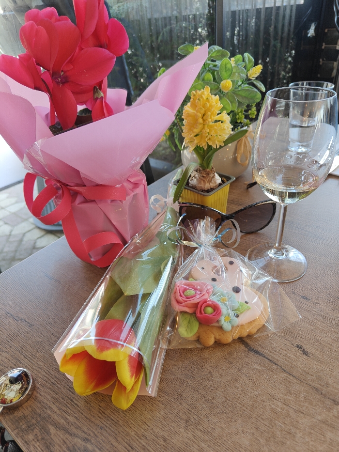 This image depicts a still life arrangement on a wooden table in an indoor setting, presumably a cafe or restaurant in Elin Pelin, Bulgaria. The scene features several objects arranged on a brown, possibly laminate, tabletop. On the left, a potted plant with vibrant red-pink cyclamen flowers is wrapped in light pink paper, secured with a red ribbon. To its right, a single red and yellow tulip, enclosed in clear plastic packaging, rests horizontally. Adjacent to the tulip is a cellophane-wrapped, bunny-shaped sugar cookie decorated with pink and light blue floral icing. A pair of black sunglasses is positioned near the cookie. Further to the right, a clear stemmed wine glass contains a small quantity of pale yellow liquid, indicative of white wine. In the midground, behind the sunglasses and wine glass, a potted yellow hyacinth plant stands upright in a yellow container. Behind the hyacinth, another decorative pot contains green artificial foliage. The background is characterized by a large window or glass partition, showing blurred reflections and indistinct views of an outdoor paved area and distant greenery, framed by dark window mullions. No people are visible in the frame, and no direct actions are occurring; the scene is static.