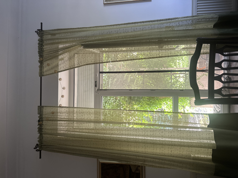 The image depicts an indoor scene in Kriukivshchyna, Ukraine, looking outwards through a large window or glass door. Two sheer, light green curtains, patterned with subtle dark dashes and featuring a darker green lower hem, hang from a dark metal curtain rod. The left curtain is largely drawn, while the right curtain is partially open, revealing a white-framed, multi-pane glass structure. Beyond the glass, vibrant green foliage from trees or bushes is visible, suggesting an outdoor garden or yard area. A faint glimpse of an object, possibly a bicycle or outdoor furniture, can be seen through a screen panel on the right side of the exterior view. Inside the room, the top of a dark wooden chair with a decorative, carved backrest is prominent in the foreground, partially obscuring the lower window view. A string of small, spherical fairy lights is suspended across the upper window frame, behind the curtains. On the left wall, a portion of a framed artwork with a dark or gold frame is visible. On the right wall, a white radiator is present near the floor. The walls and ceiling are white, and the room appears to be lit by natural light emanating from outside. No individuals are present.