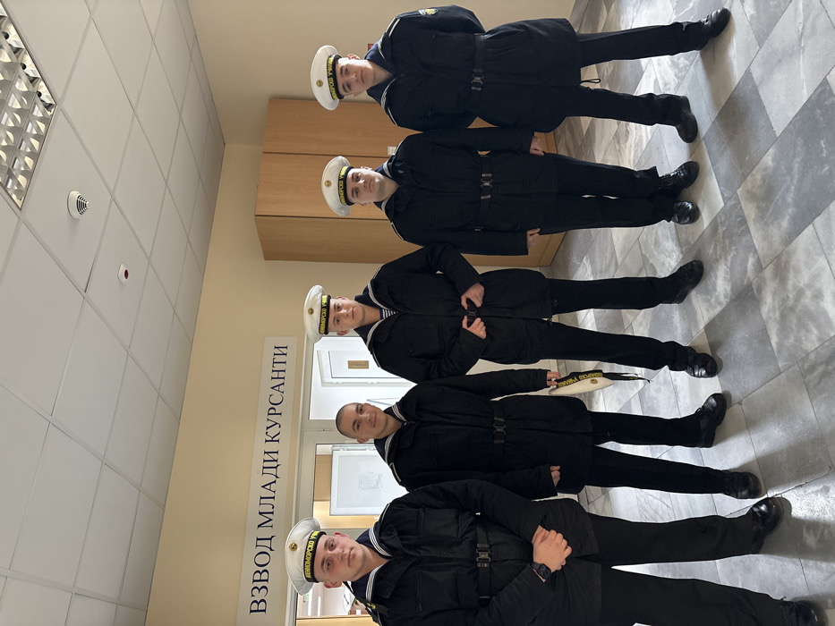 Five young male naval cadets stand in a posed line within an interior space of the Nikola Vaptsarov Naval Academy in Varna, Bulgaria
