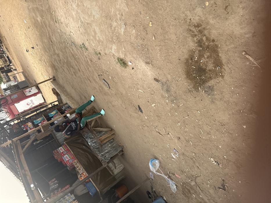 A man sits on a makeshift wooden structure, possibly a shop, wearing dark clothes, green pants, and light blue shoes. The area appears to be an outdoor market or street stall. The ground is dusty and littered with debris, including a plastic bag. A large, dark stain is visible on the ground. The structure is stocked with various items, and utility wires are overhead.