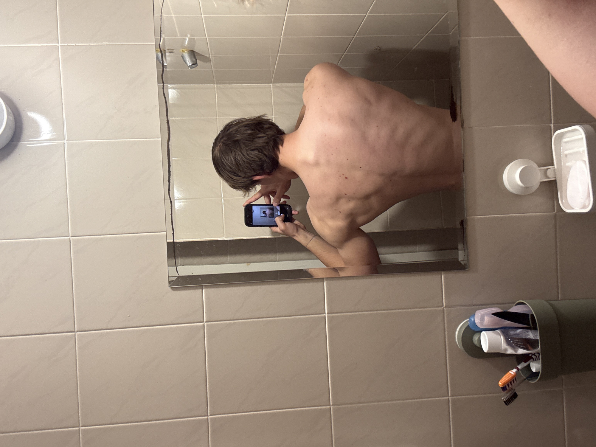 A man is reflected in a bathroom mirror, holding a smartphone and taking a picture of his bare torso. The bathroom has light-colored square tiles on the walls and floor. The mirror reflects a shower head and shower tiles. There's a soap dish, a toothbrush holder with toothbrushes and toothpaste, and other bathroom fixtures visible in the scene. The location is not identifiable from the given image.