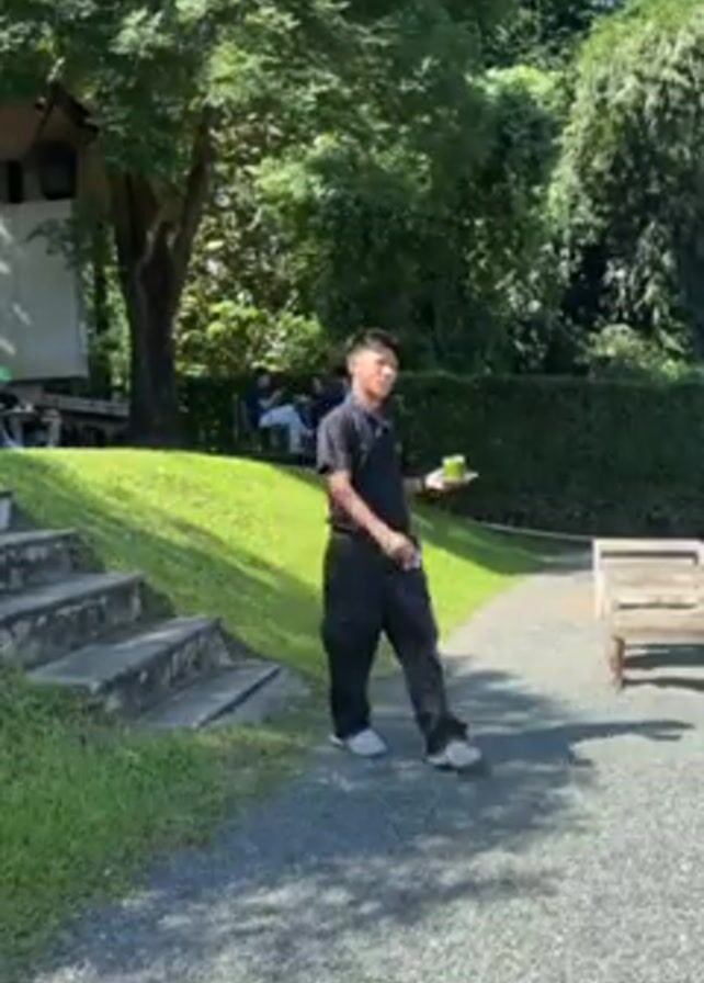 young man walking from the left to the right, carrying something in his hands, in a grassy area outdoors. The man is wearing black pants and a black shirt. He passes by a small set of stairs, a patch of green grass, and a wooden bench. In the background, several people are sitting on a bench underneath trees. The ground is covered in gravel.