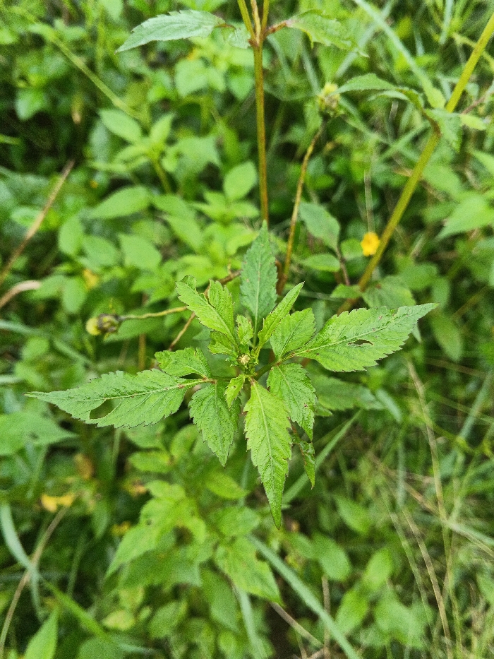 A close-up, top-down view captures a vibrant green plant in dense foliage. The central plant features several pinnately lobed or deeply serrated leaves, some exhibiting minor insect damage or irregular edges. These leaves are arranged radially around a central, small, light-colored bud or developing flower. The background is a soft-focus blur of various shades of green vegetation, including additional plant leaves and slender blades of grass, with faint yellow accents from other small flowers or buds. The scene is illuminated by natural light, depicting an outdoor environment in Unknown, Nepal. No people, animals, or man-made objects are visible.