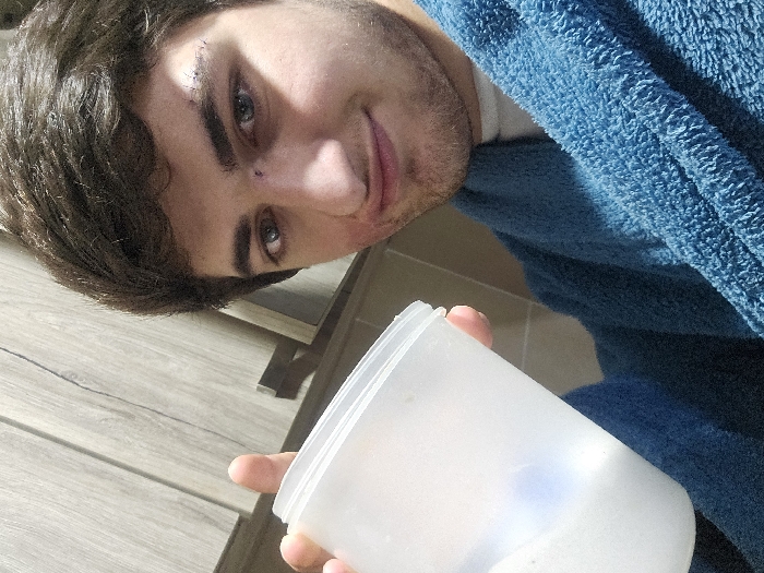 The image is a close-up, eye-level selfie-style photograph of a young adult male, estimated to be in his early to mid-twenties, captured in an indoor residential setting. He has dark, wavy hair, blue eyes, and light stubble on his chin and jawline. The subject displays several facial injuries: two distinct sutures are visible above his left eyebrow, a small dark mark or bruise is present on the bridge of his nose, and a reddish abrasion or bruise is evident on his right cheek, extending towards the jawline. He is wearing a textured, possibly terry cloth, blue robe over a white inner garment, visible at the collar. In his left hand (from the subject's perspective), he holds a translucent white plastic cup or shaker bottle, which contains a white liquid, likely milk or a protein shake. The subject is looking directly into the camera with a slight, subtle smile. The background consists of light-colored wooden panels or cabinets with a vertical grain pattern, suggesting a kitchen or bathroom environment. A darker, horizontal surface is partially visible below the cabinets. The lighting is artificial and evenly distributed.