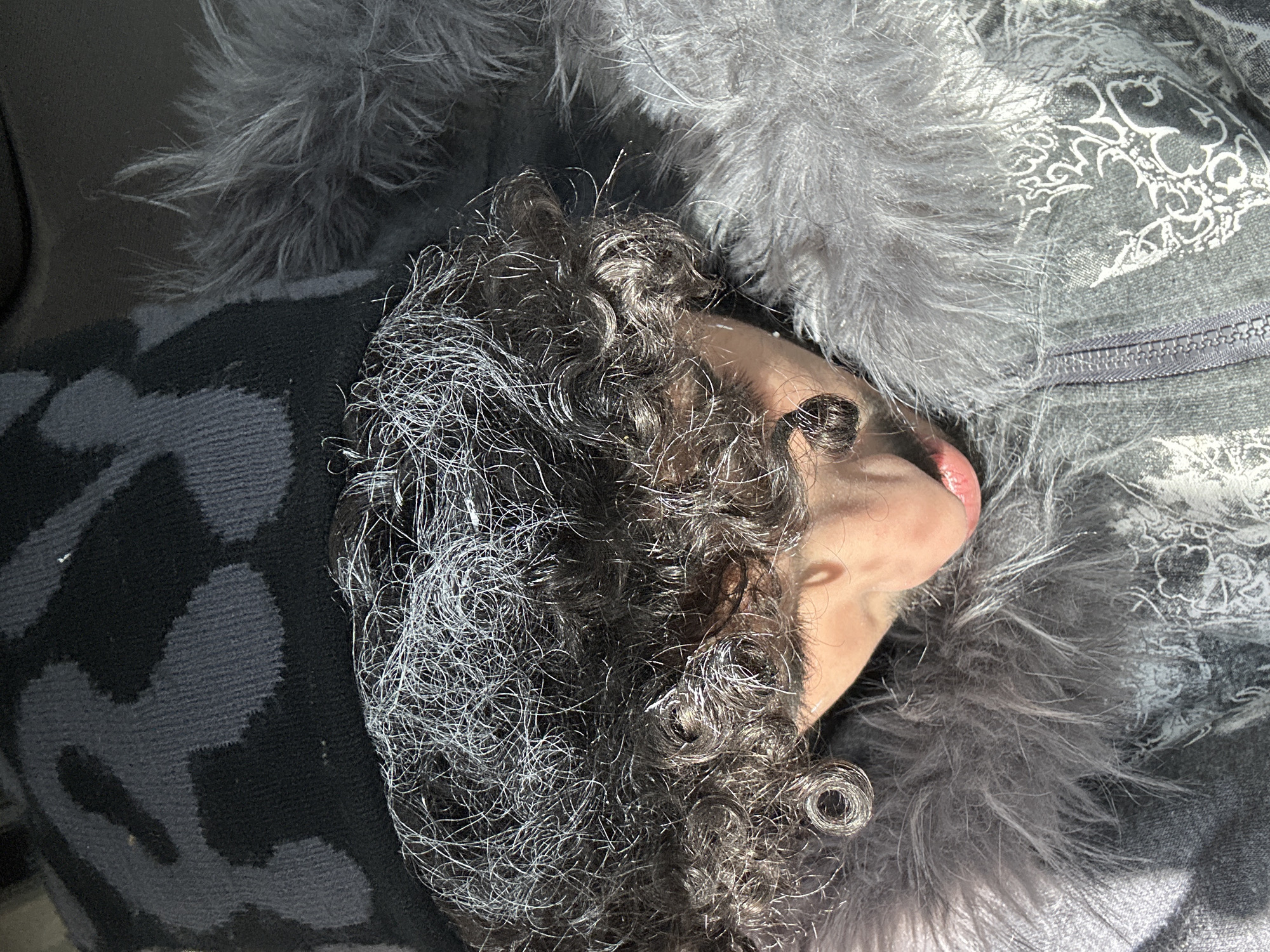 A close-up, top-down view depicts an individual with dark, curly hair heavily intermixed with white or grey strands, illuminated by direct overhead light. The person's head is tilted forward and down, obscuring the eyes, with only the nose, mouth, and a portion of the chin visible. The mouth is slightly parted, revealing a pink lower lip. The individual is wearing a dark grey and black knit hat with an abstract or mottled pattern. Below the hat, a grey zippered jacket or hooded garment is visible, featuring an extensive, fluffy grey faux fur trim around the collar or hood. The grey fabric of the jacket exhibits an intricate white pattern. Strong shadows are cast on the individual's skin due to the direct light source. The immediate environment consists of the subject's clothing and hair. The specific location in the city of Wissous, France, cannot be determined from the image.