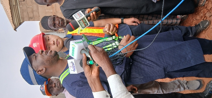 An outdoor scene in Rigasa, Nigeria, features six identifiable males gathered on reddish-brown earth under a hazy sky. A dark-skinned male, centrally positioned, wears a blue mesh baseball cap, a dark blue pinstriped tunic over dark pants, and a green and yellow reflective safety harness. He is actively speaking, with his mouth open. Three microphones are directed towards him: one white cube-shaped microphone with an obscured logo (partially showing "Television International"), another white cube-shaped microphone branded "KSMC", and a black microphone with a red tip displaying the "ARISE NEWS" logo. These are held by two sets of hands; one hand, clad in a white long-sleeved shirt with cuff links, also holds a green mobile phone tucked between the microphones. Immediately behind the primary speaker is a light-skinned male of East Asian descent, wearing a red hard hat, a blue shirt, and a yellow and orange reflective safety vest. He observes the scene with a neutral expression. To the speaker's left, a dark-skinned male wears an orange and black baseball cap. To the right of the Asian male stands an older dark-skinned male with a grey beard, wearing a black kufi and a dark traditional garment. A sixth male is partially visible on the far right. The background consists of rudimentary structures, including unpainted brick walls and corrugated metal roofing. Blue and black cables extend from the microphones.