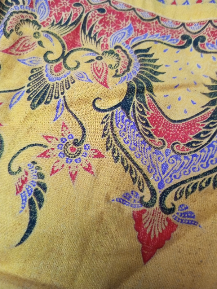 The image showcases a vibrant, patterned textile. Dominated by a mustard-yellow background, the fabric is adorned with intricate floral and avian motifs in shades of red, black, and blue. These designs feature swirling lines and stylized shapes, creating a rich, textured effect. The fabric appears slightly aged, with subtle discoloration and creases adding to its character. The close-up shot reveals the detailed craftsmanship of the fabric, highlighting the artistry of the design.