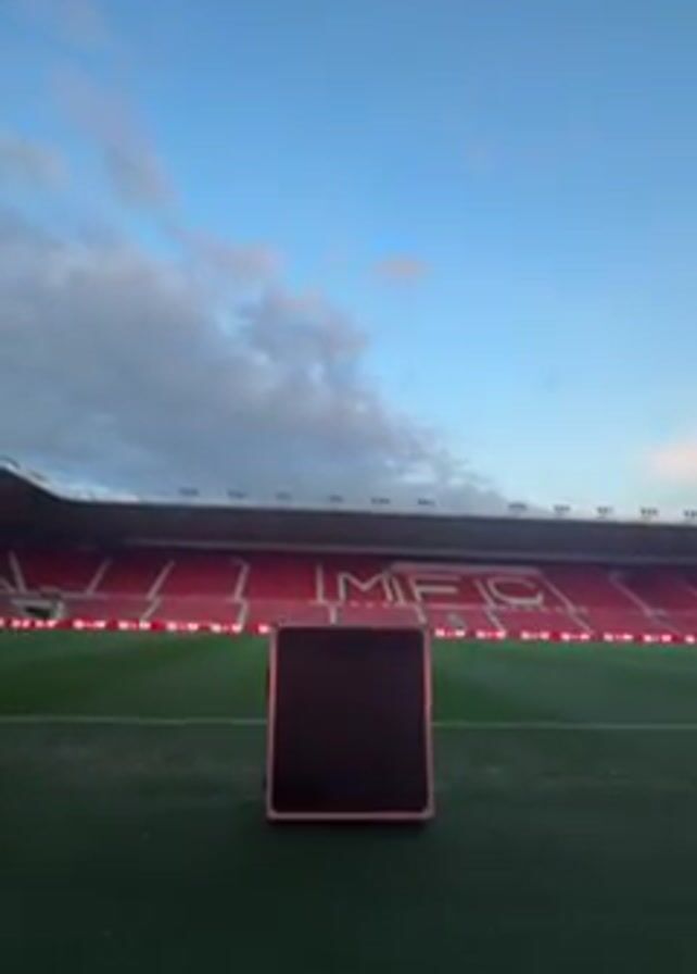 A video displays a soccer field with empty red seating and a black screen in the center, facing the camera. "MFC" is visible on the red seating. Suddenly, flames shoot up into the air behind the screen.