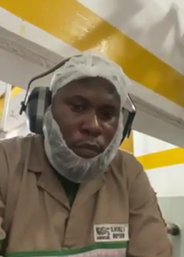 A man is standing in a factory setting. He is wearing a tan uniform with a green stripe across the chest, a white hairnet and beard net, and gray noise-canceling headphones. The uniform has a patch on the chest with the name "OLAKUNLE S." and the number "801108" printed on it. The factory interior includes yellow striping along the walls. To the right of the man, metal shelving can be seen. The man looks directly into the camera with a serious expression. The sound of machinery is present.